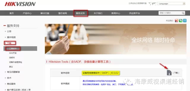a,一根网线,把摄像头和电脑直连起来。(也可以把摄像头和电脑接在同一个交换机下。)b,电脑软件:SADP,即设备网络搜索软件。下载地址:海康官网-【服务支持】-【下载】-【工具软件】-【Hikvision Tools(含SADP、录像容量计算等工具)】。