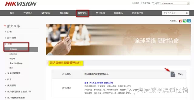 a)把摄像头和电脑置于同一个交换机下。b)在海康官网,【服务支持】-【下载】-【工具软件】-【网络摄像机配置管理软件】下载网络摄像机配置管理软件。